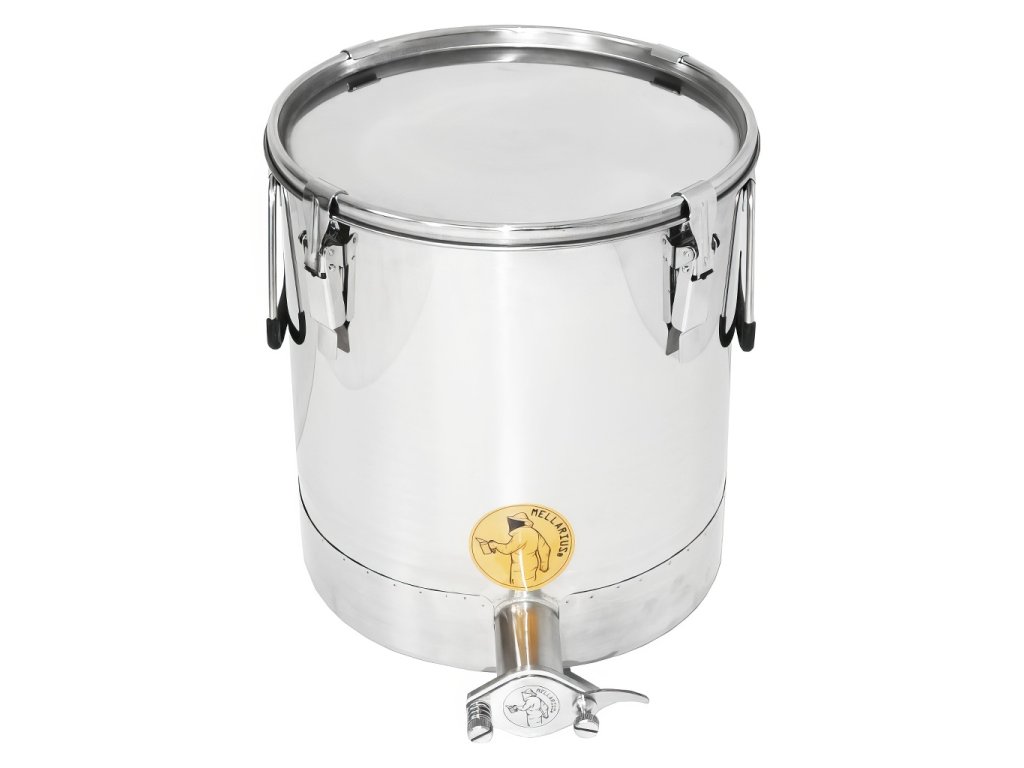 Stáčecí nerezová nádoba na 35 kg medu s nerezovým kohoutem a nerez poklicí s těsněním.
